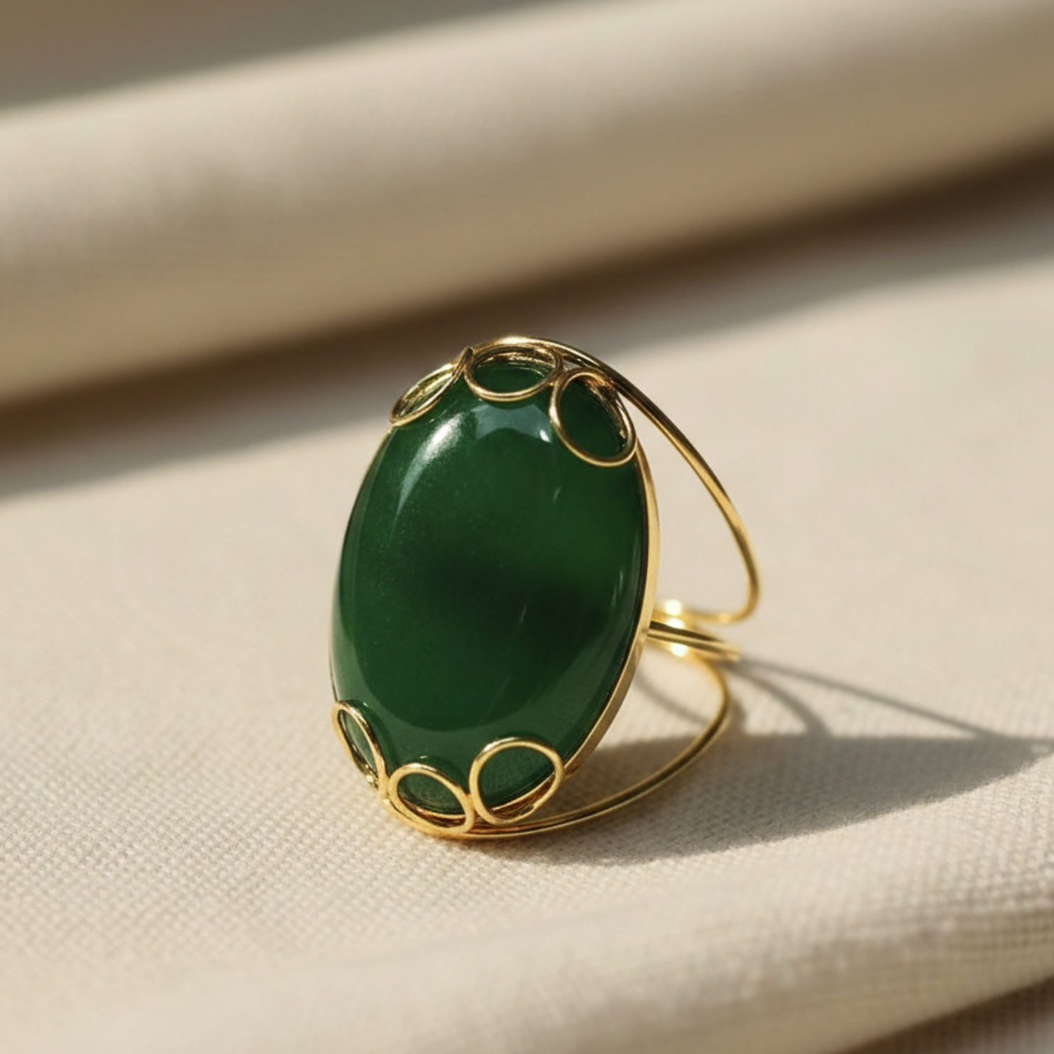 O Anel Império em Ouro 18k é uma joia de design marcante que traduz poder, equilíbrio e sofisticação. No centro da composição, o crisoprásio natural encanta com seu tom verde marcante e luminoso, símbolo de renovação, prosperidade e harmonia interior. Cada pedra é única, revelando nuances naturais que tornam a joia ainda mais especial.