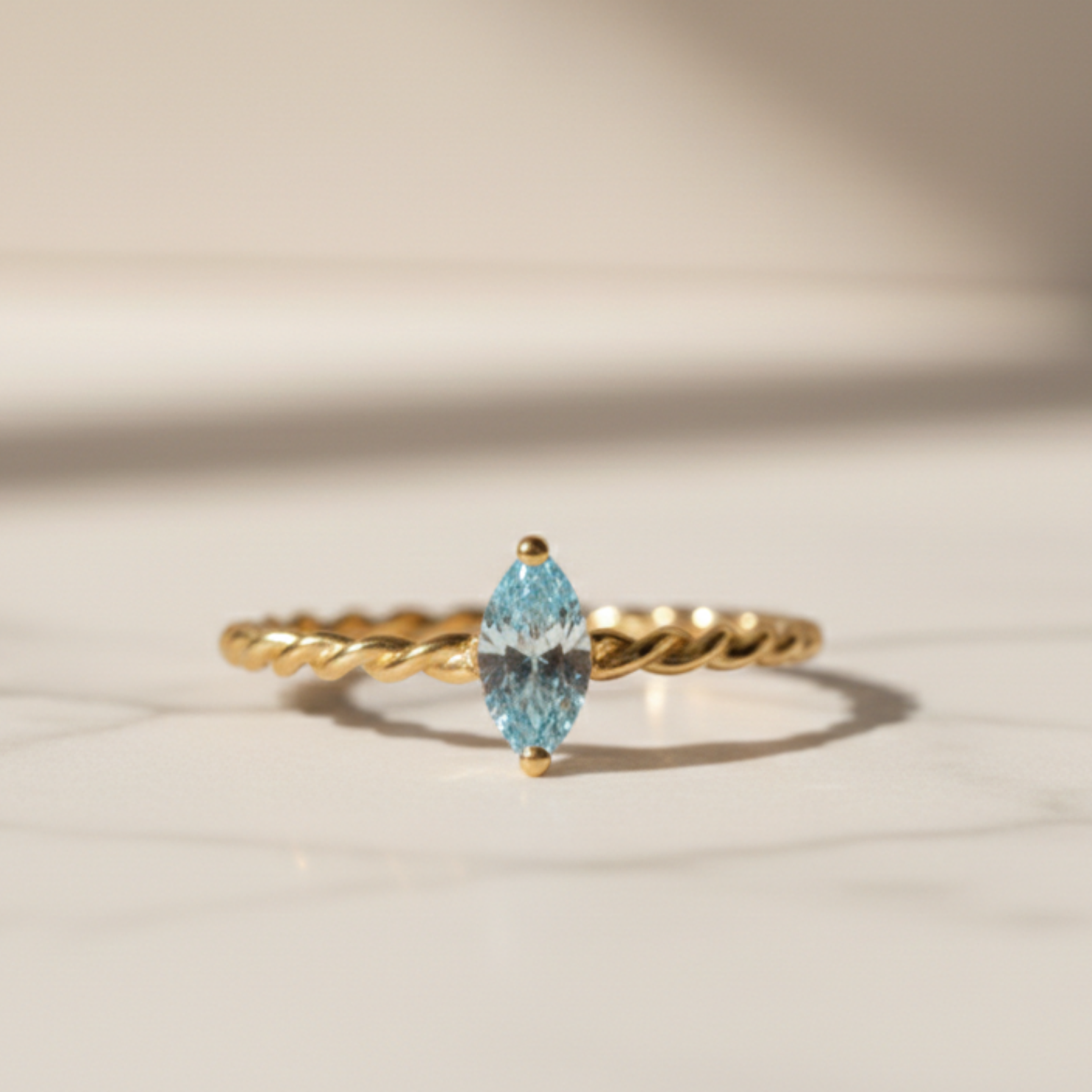 O Anel Marquise Azul em Ouro 18k expressa leveza, serenidade e elegância em uma joia de design delicado e atemporal. A pedra central em lapidação navete, com tonalidade azul suave e luminosa, reflete a luz de forma cristalina, evocando calma, clareza e harmonia.