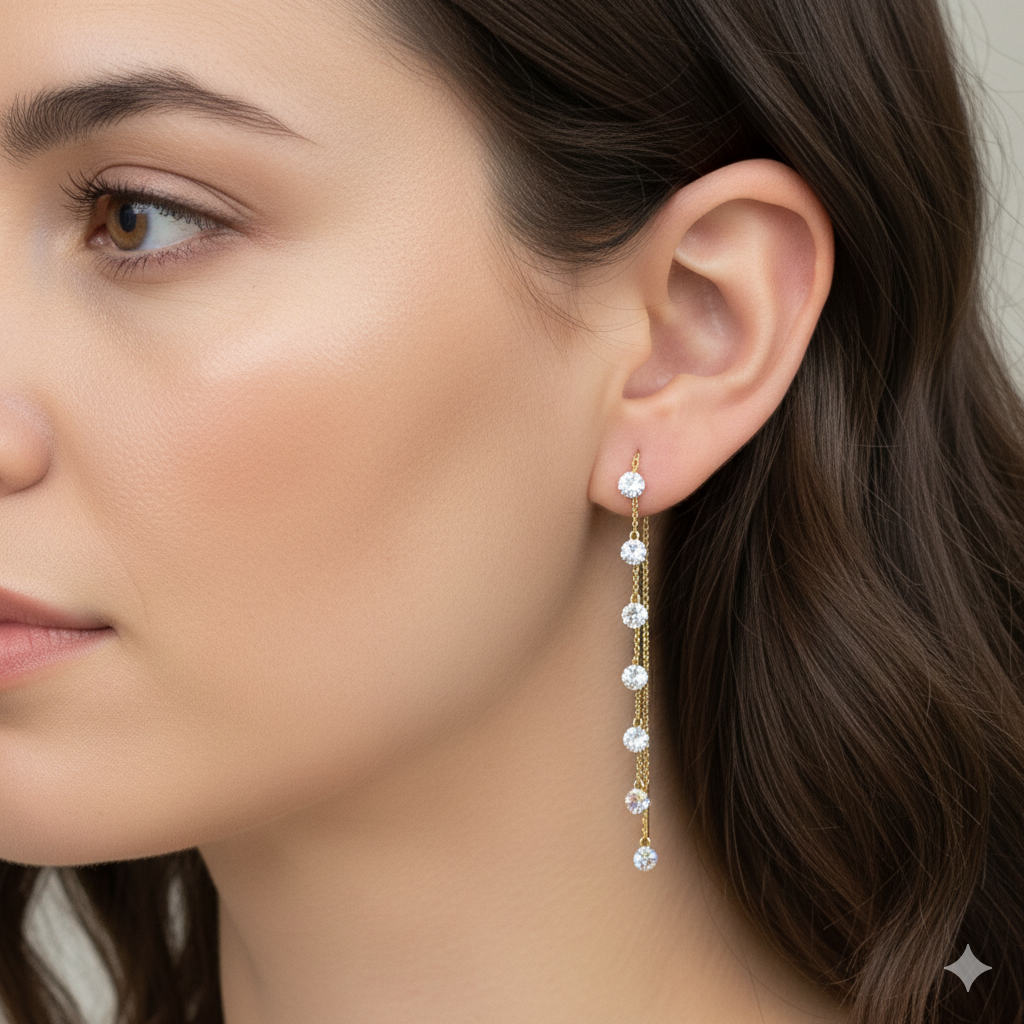 O brilho nobre do ouro 18k se une ao charme das delicadas pedrinhas pendentes, que dançam suavemente a cada passo, refletindo a luz de forma sutil e sofisticada.