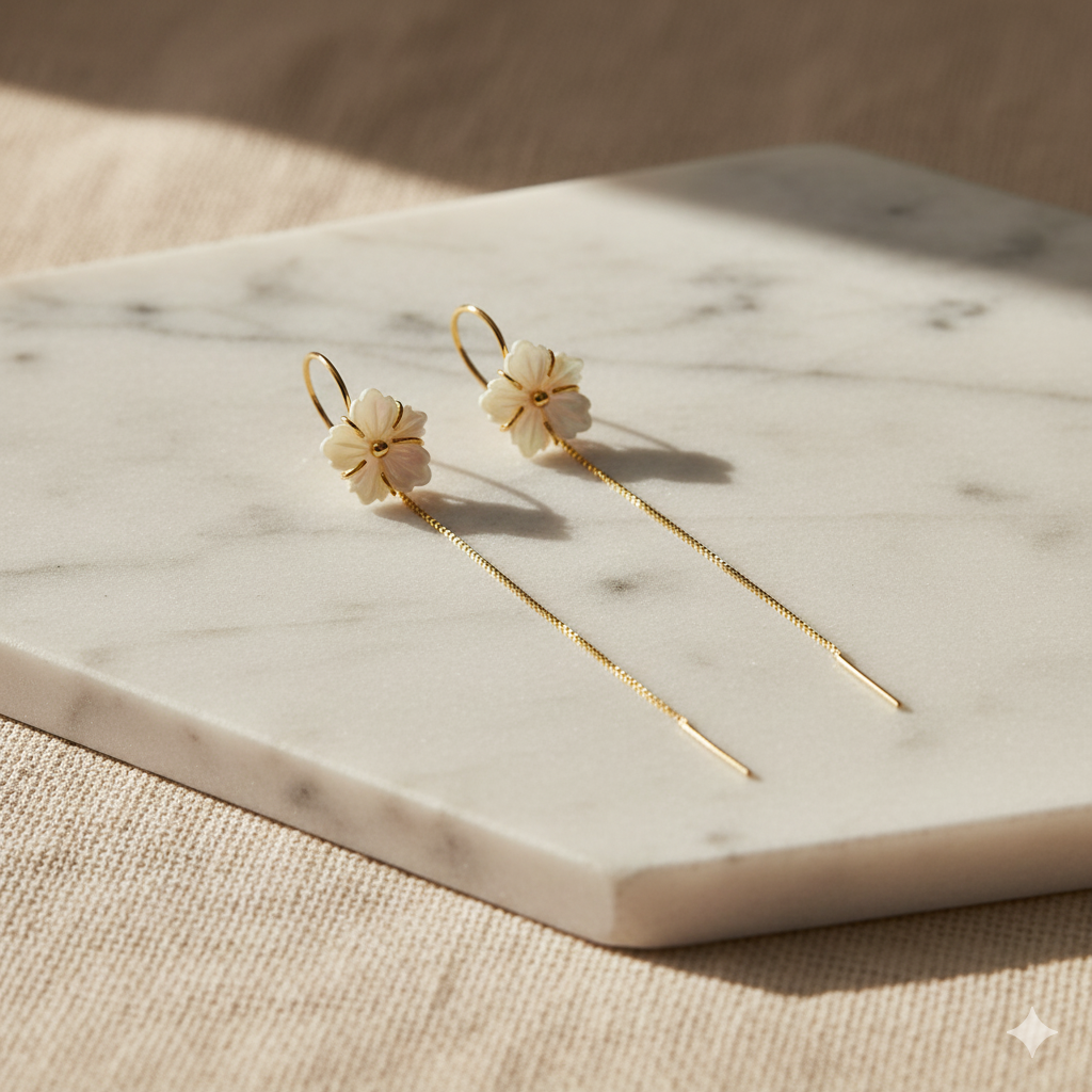 O design em gancho realça a leveza da flor em madrepérola de 10mm, cuja iridescência suave contrasta com o balanço da veneziana e o brilho quente do ouro 18k.