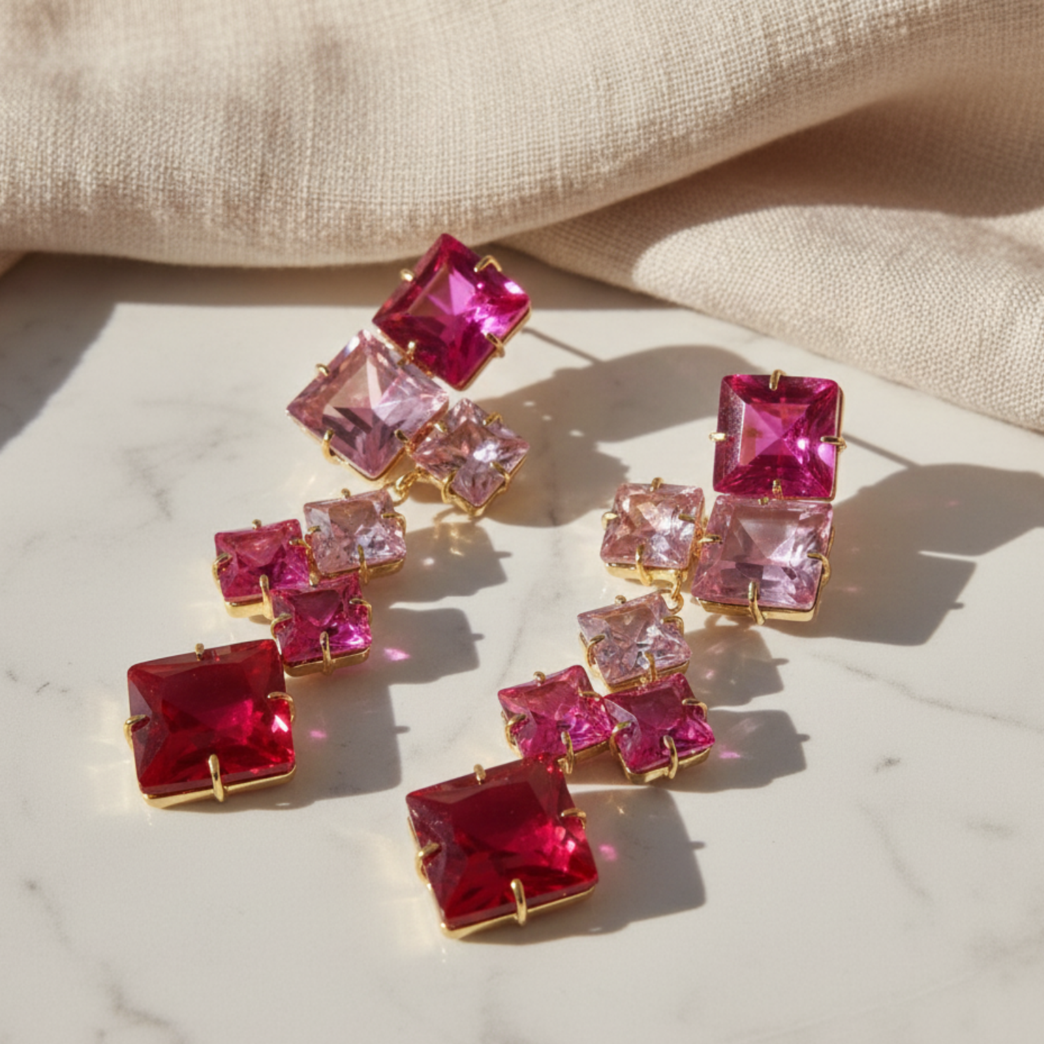 O Brinco Espectro Magenta em Ouro 18k apresenta um degradê sofisticado de pedras carré, que transitam harmoniosamente entre os tons vibrantes de Rubi, Rubi Rosé e Rubi France.