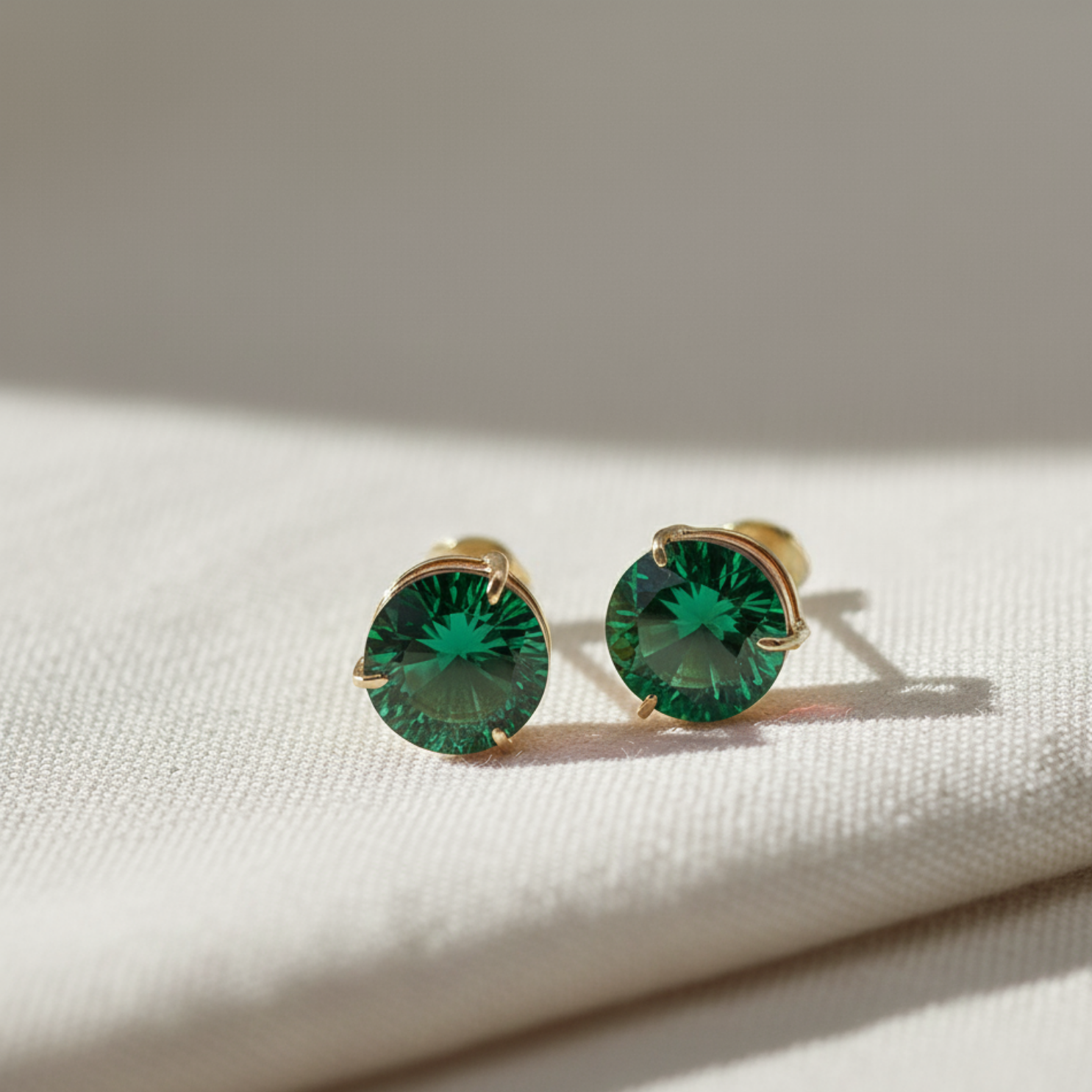 Delicado e marcante, este ponto de luz em formato de redonda apresenta uma pedra verde esmeralda de 6mm, lapidada para refletir a luz com intensidade e brilho singular.