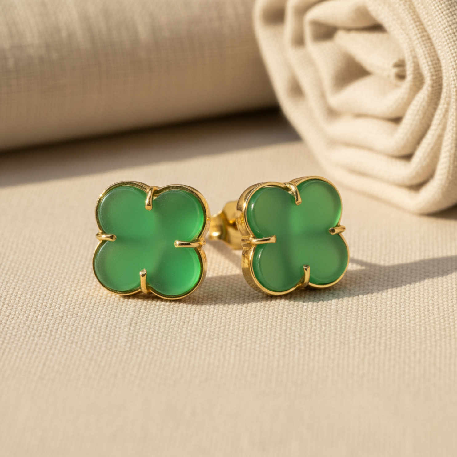 O Brinco em formato de trevo, confeccionado em Ouro 18k, é adornado com crisoprásio natural, cuja cor verde suave transmite frescor, equilíbrio e sofisticação.
