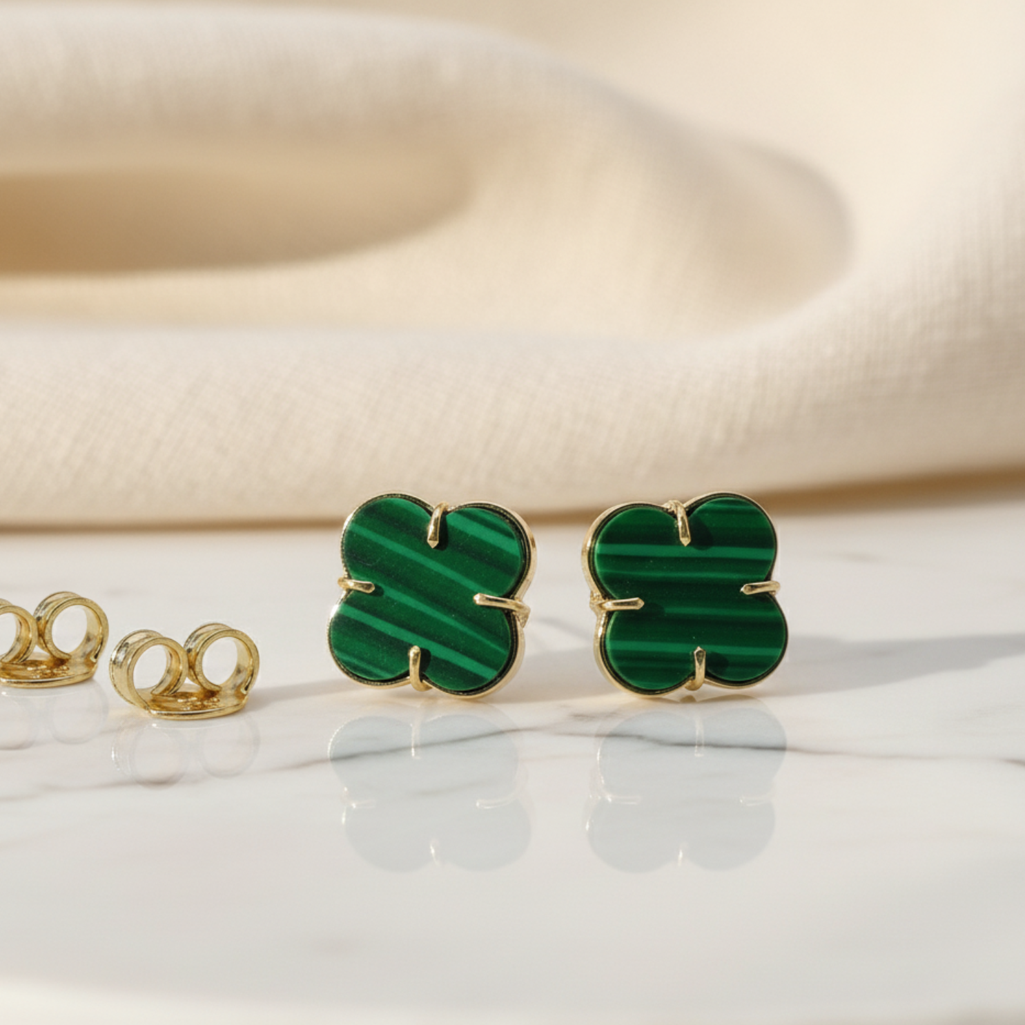 O Brinco em formato de trevo, confeccionado em Ouro 18k, é adornado com malaquita natural, pedra conhecida por suas listras verdes marcantes e seu efeito hipnotizante.