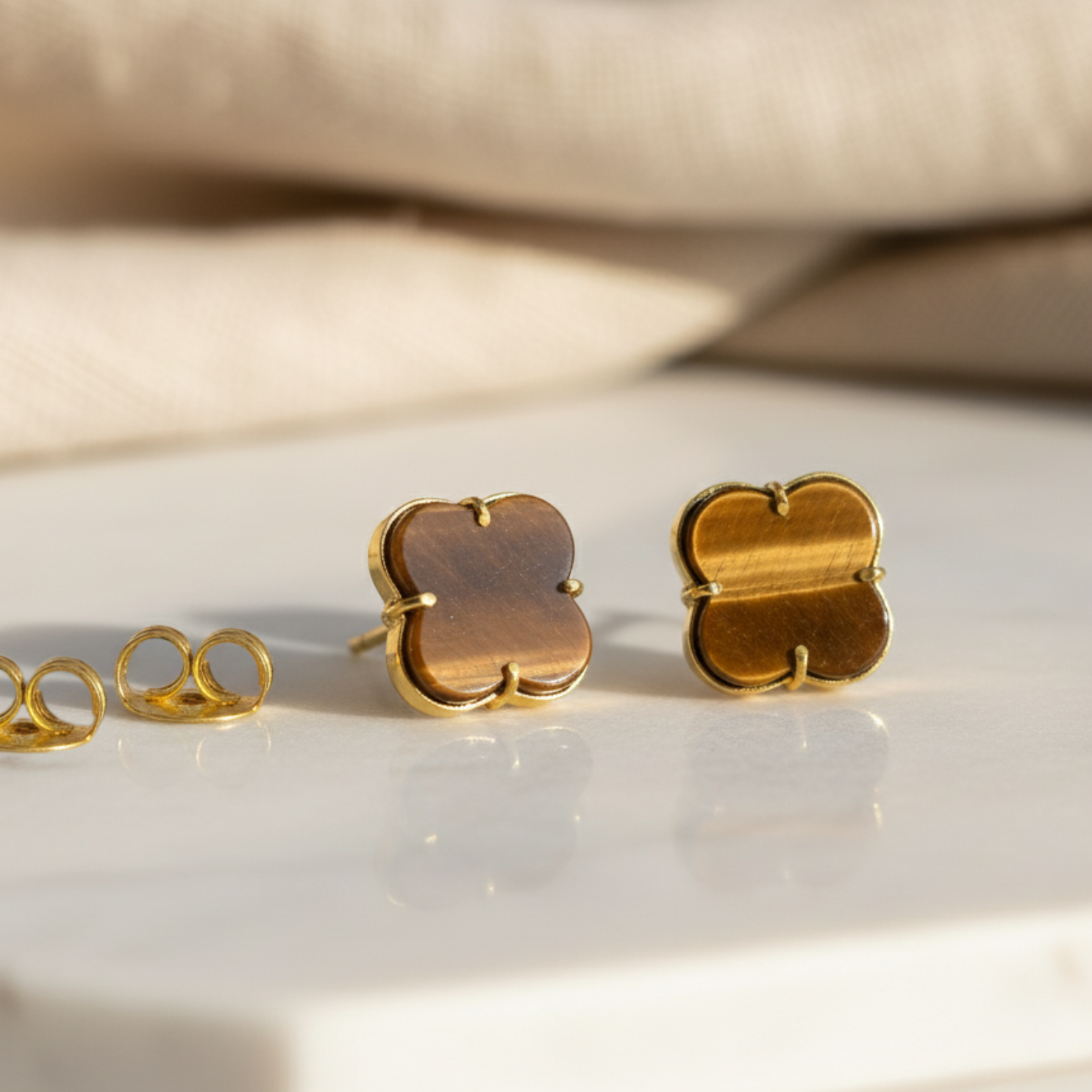 O Brinco em formato de trevo, em Ouro 18k, é realçado pela pedra natural Olho de Tigre, que transmite energia, equilíbrio e brilho intenso.