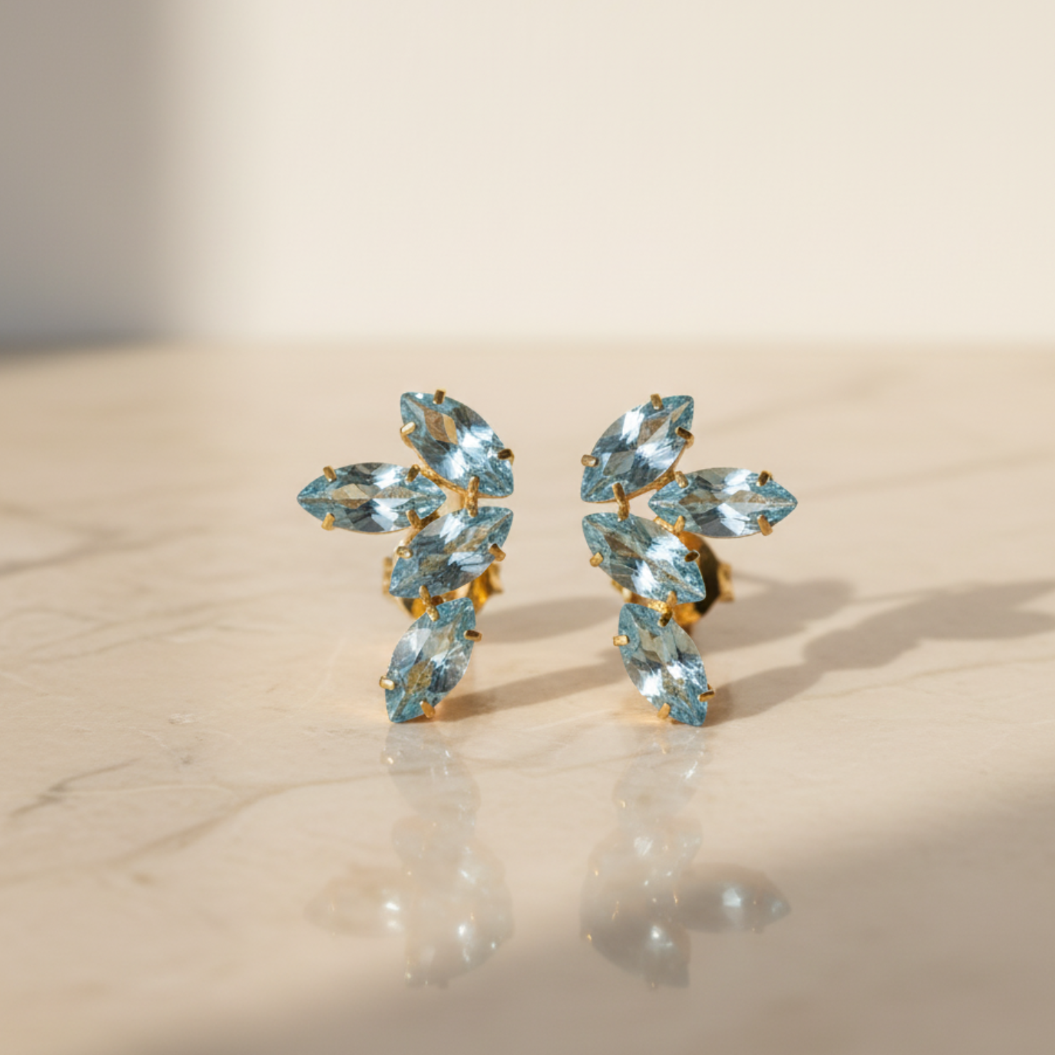 O Brinco Wings em Ouro 18k traz o delicado formato que lembra uma asas, realçado pelas pedras naturais de topázio sky, cuja tonalidade suave e luminosa acrescenta brilho e charme singular.