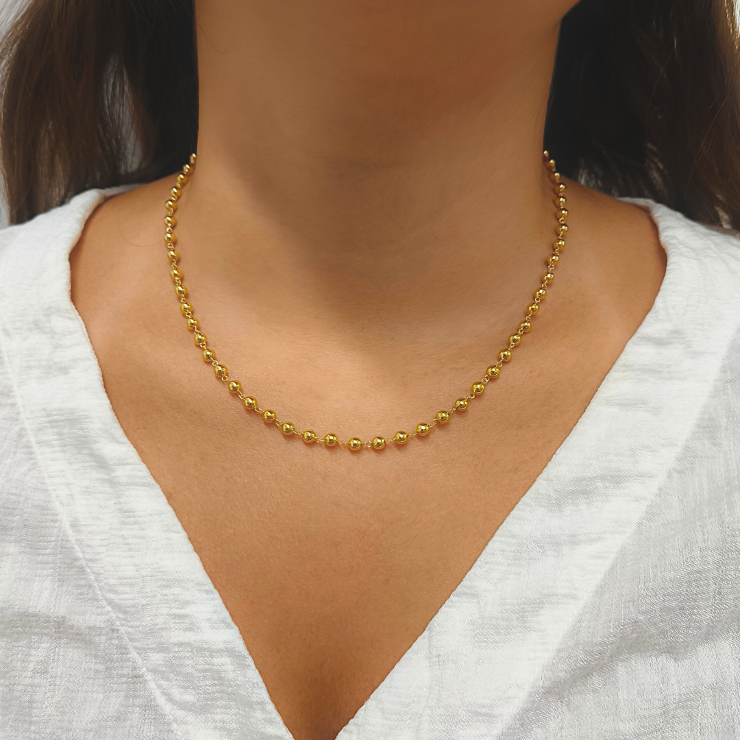 O Colar Ouro 18k Bolinhas Juntas 4mm é a escolha perfeita para quem busca um visual elegante com um toque moderno. Suas esferas de ouro 18k, com 4mm de diâmetro, criam uma textura única e marcante, refletindo a luz com suavidade e sofisticação.