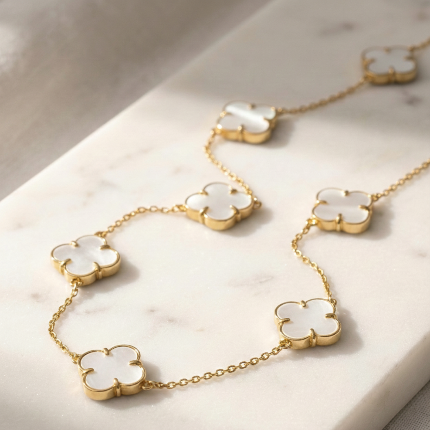 Este colar em Ouro 18k apresenta nove delicados trevos de madrepérola, distribuídos harmoniosamente ao longo da corrente, criando um efeito leve e elegante. Cada trevo reflete a luz de forma sutil, destacando o brilho natural da madrepérola e a nobreza do ouro.