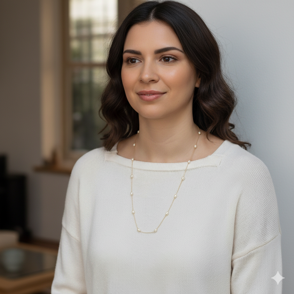Confeccionado em Ouro 18k, este colar apresenta pérolas naturais cuidadosamente espaçadas ao longo da corrente, criando um efeito leve e harmonioso que valoriza o colo com graça e presença. O brilho sutil das pérolas, combinado à nobreza do ouro, confere à peça um charme atemporal e refinado.