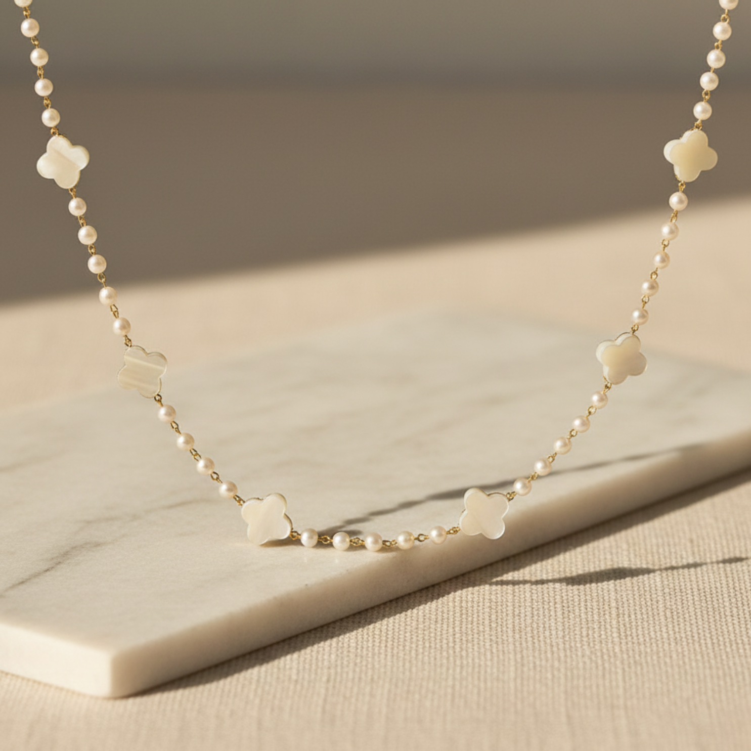 Confeccionado artesanalmente em Ouro 18k, este colar é feito pérola por pérola, intercaladas com trevos de madrepérola natural, criando um design único, leve e elegante. Cada detalhe reflete cuidado e precisão, resultando em uma joia que combina brilho, suavidade e charme atemporal.
