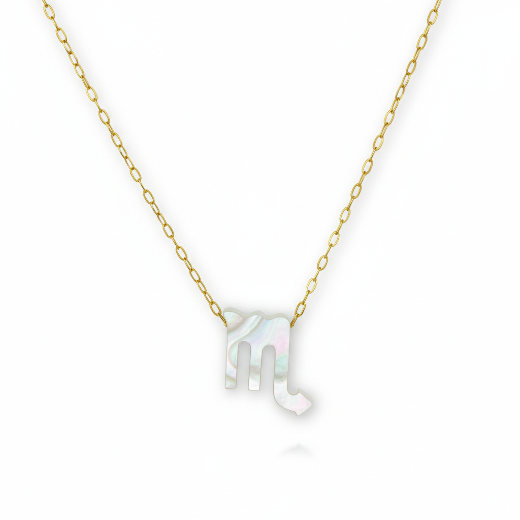 Confeccionado em Ouro 18k, este colar apresenta o símbolo do signo de Escorpião delicadamente esculpido sobre uma base de madrepérola natural, que irradia um brilho sutil e sofisticado. A joia é complementada por uma corrente zeta, conhecida por sua resistência e brilho intenso, criando um contraste perfeito entre o dourado e o tom nacarado.