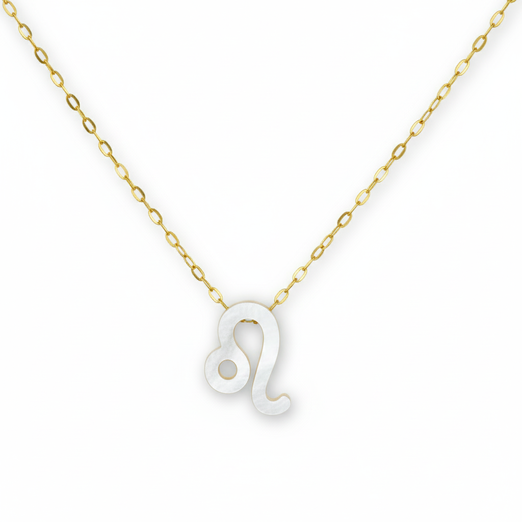 Confeccionado em Ouro 18k, este colar apresenta o símbolo do signo de Leão delicadamente esculpido sobre uma base de madrepérola natural, que irradia um brilho sutil e sofisticado. A joia é complementada por uma corrente zeta, conhecida por sua resistência e brilho intenso, criando um contraste perfeito entre o dourado e o tom nacarado.