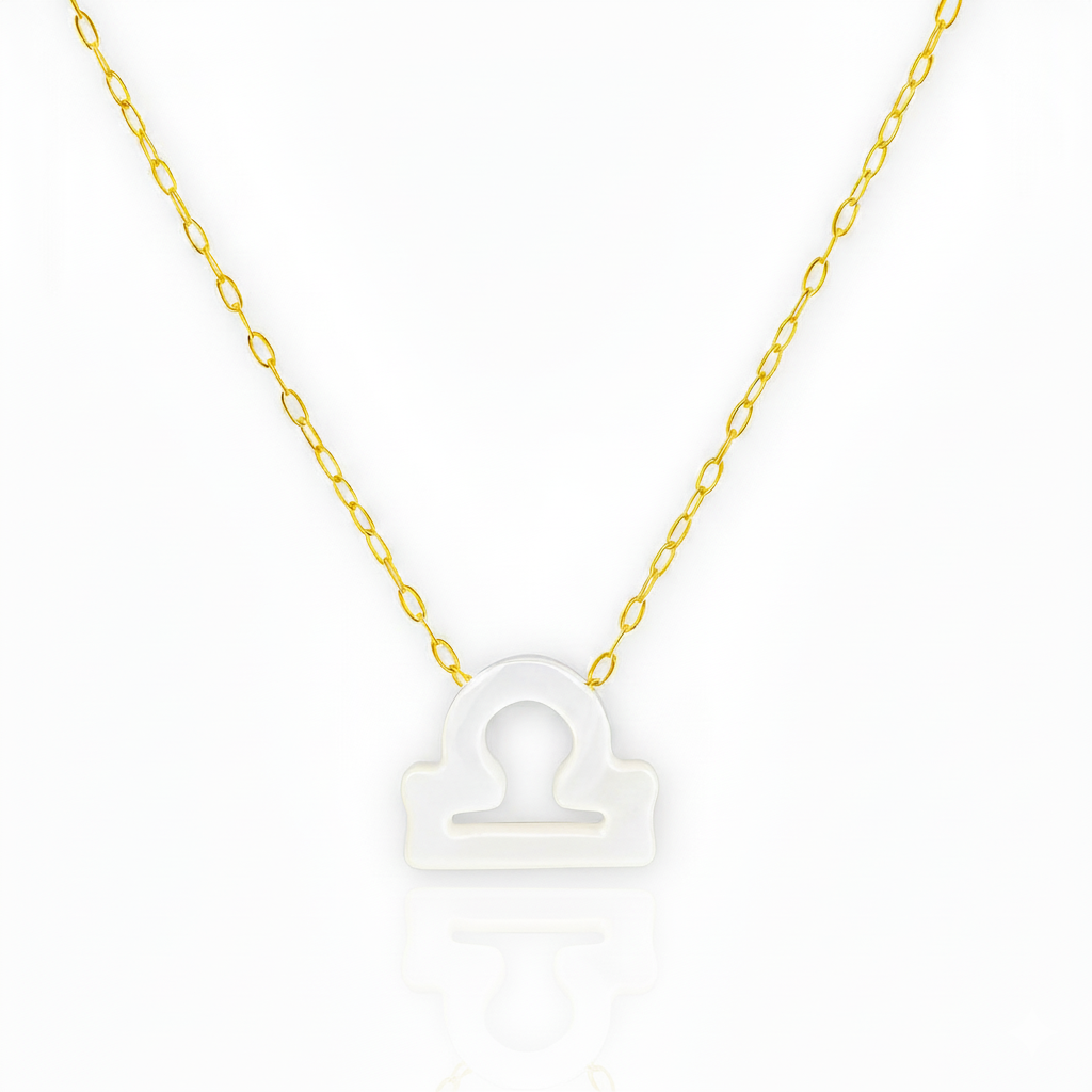 Confeccionado em Ouro 18k, este colar apresenta o símbolo do signo de Libra delicadamente esculpido sobre uma base de madrepérola natural, que irradia um brilho sutil e sofisticado. A joia é complementada por uma corrente zeta, conhecida por sua resistência e brilho intenso, criando um contraste perfeito entre o dourado e o tom nacarado.