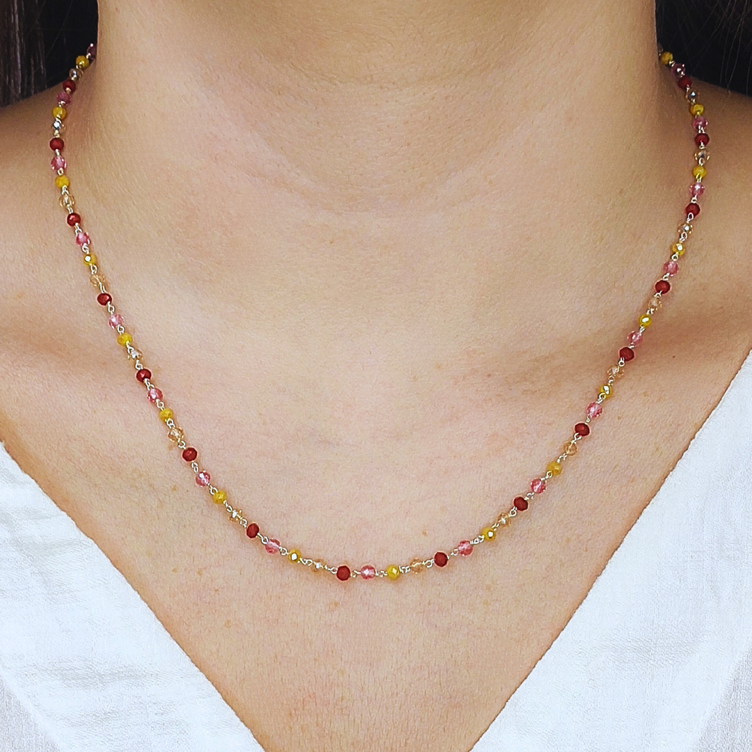 Com as cores suaves e vibrantes de uma tarde aconchegante, o Colar Prata Frescor da Tarde é uma celebração da leveza e do equilíbrio. Feito com cristais de 3mm em tons de vermelho, laranja, bege e amarelo, todos delicadamente amarrados com um fio fino de prata, essa joia transmite uma sensação de calma e frescor. Uma peça delicada, harmoniosa e cheia de vida — perfeita para iluminar o dia com elegância sutil.
