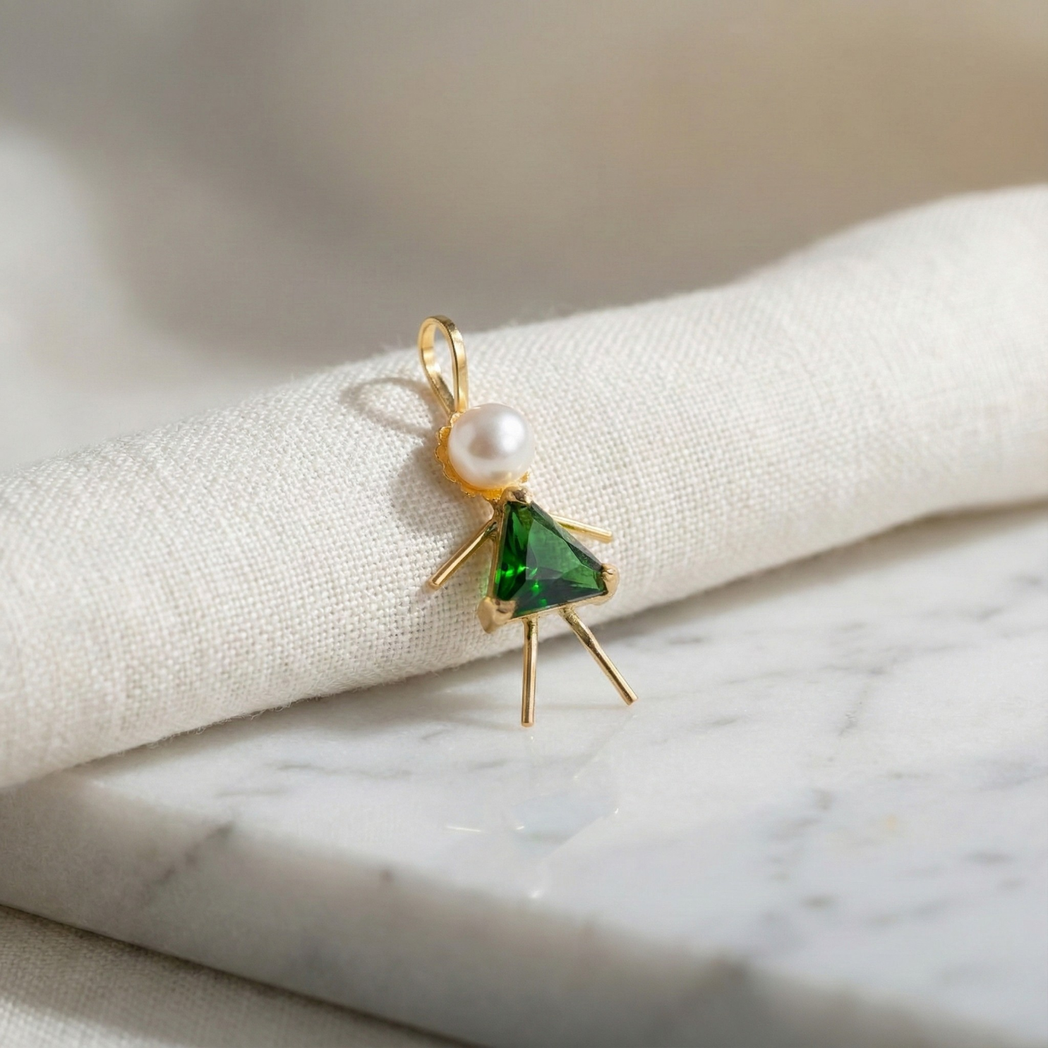 Confeccionado em Ouro 18k legítimo, este pingente apresenta o delicado desenho de uma menina, trazendo como detalhes uma pérola natural na cabeça e um triângulo em pedra verde que forma o vestido, transmitindo vitalidade, esperança e proteção.