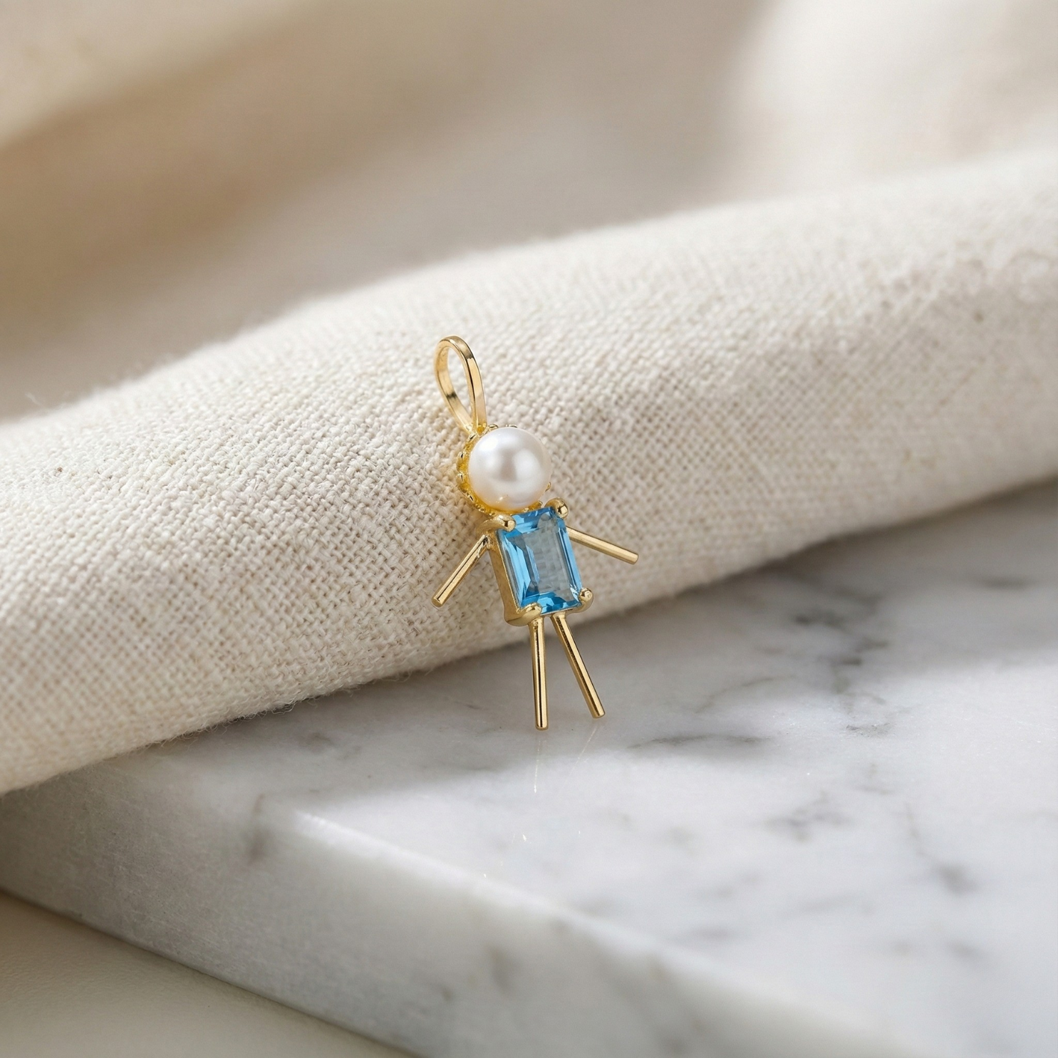 Confeccionado em Ouro 18k, este delicado pingente traz o desenho de um menino, com uma pérola natural representando a cabeça e uma pedra baguete azul formando a roupa – cor que simboliza serenidade, proteção e confiança.