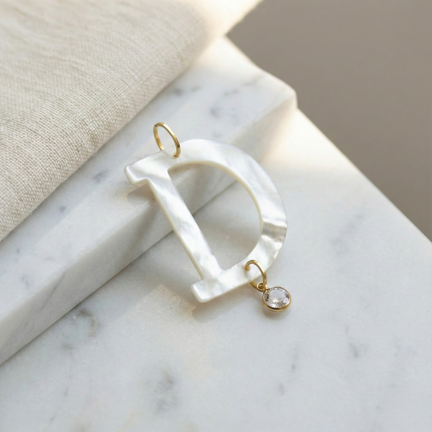 Confeccionado em Ouro 18k legítimo, este pingente traz a letra em madrepérola natural com pingente de zircônia branca, resultando em um contraste elegante e sofisticado.