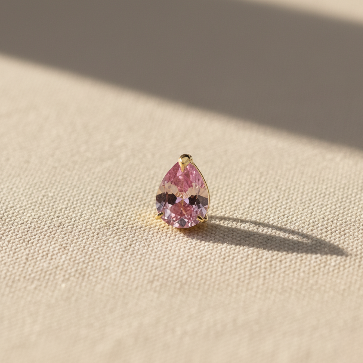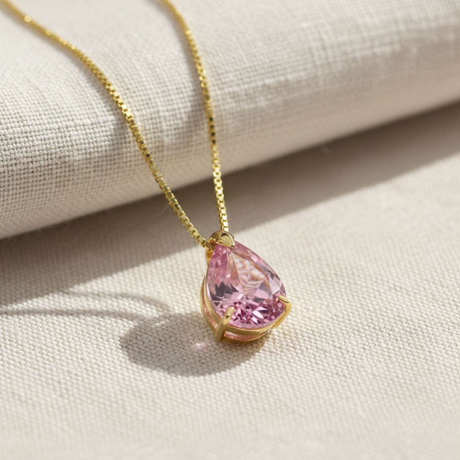 Confeccionado em Ouro 18k legítimo, este pingente apresenta uma zircônia rosa lapidada em 6x8mm com lapidação que maximiza o brilho, que transmite feminilidade, suavidade e romantismo.