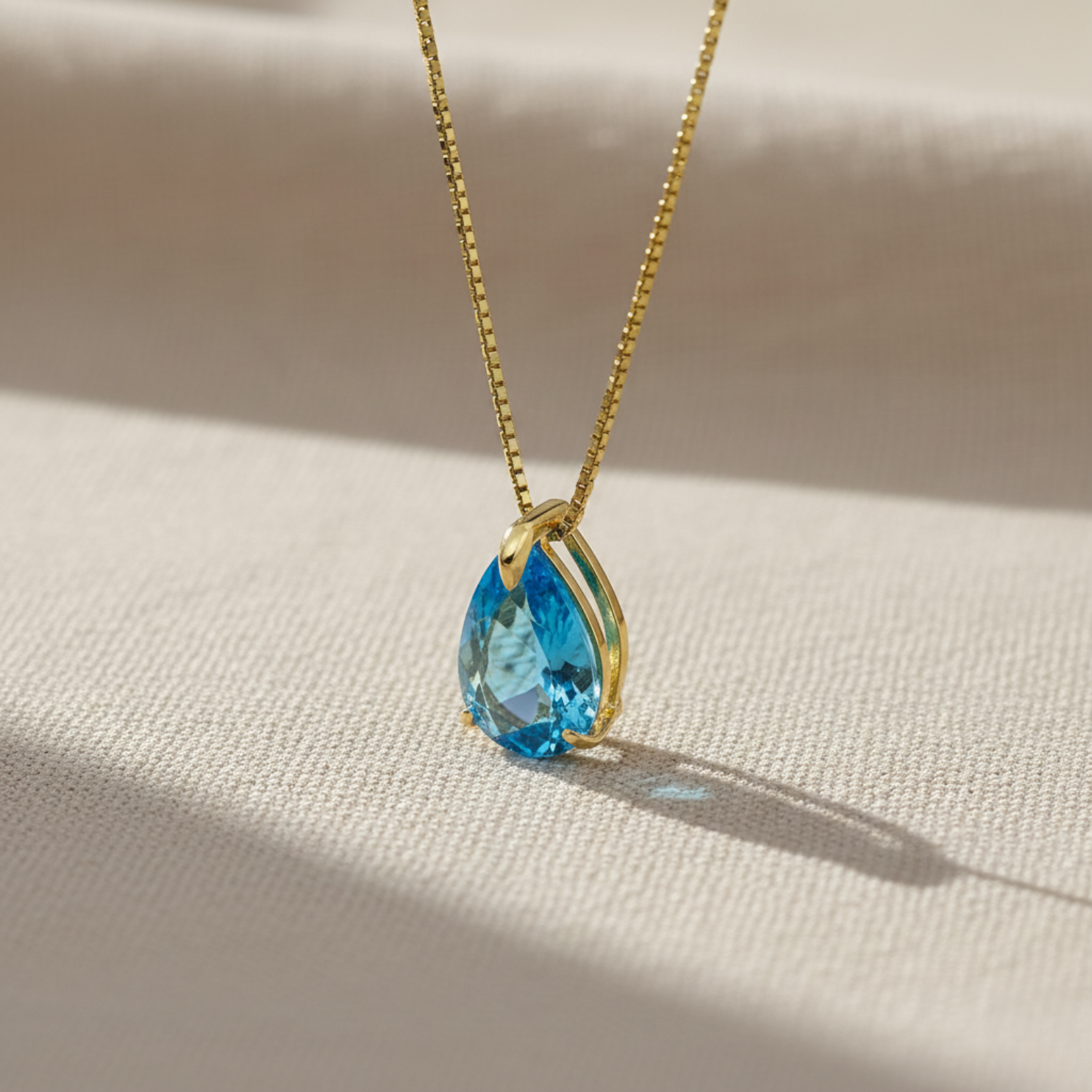 Produzido em Ouro 18k legítimo, este pingente traz uma zircônia azul de 6x8mm com brilho intenso e lapidação impecável, pedra que simboliza harmonia, serenidade e elegância atemporal.