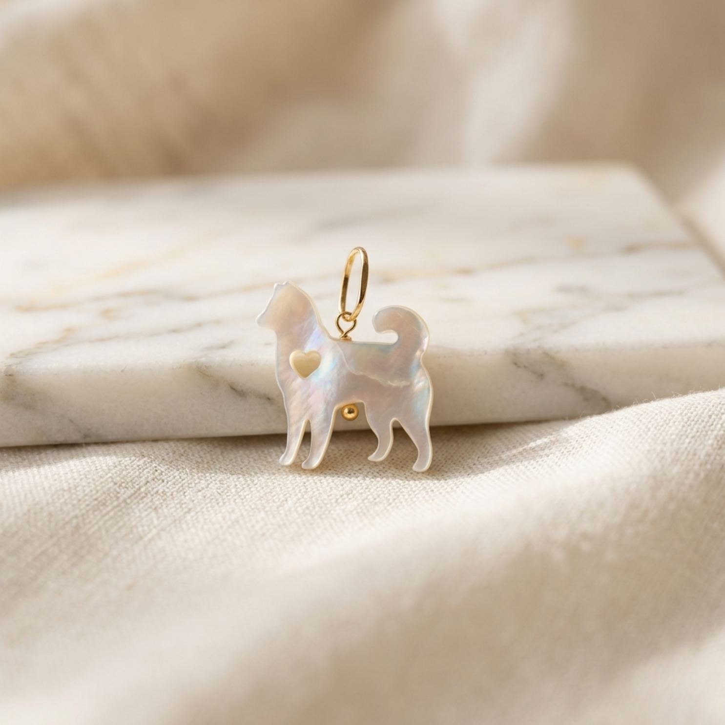 Com design marcante e cheio de personalidade, o Pingente Pets Ouro 18K Husky Madrepérola é uma homenagem perfeita à força, lealdade e beleza dessa raça tão admirada. A silhueta do husky é delicadamente esculpida em madrepérola natural, revelando um brilho iridescente único que valoriza cada detalhe da peça.