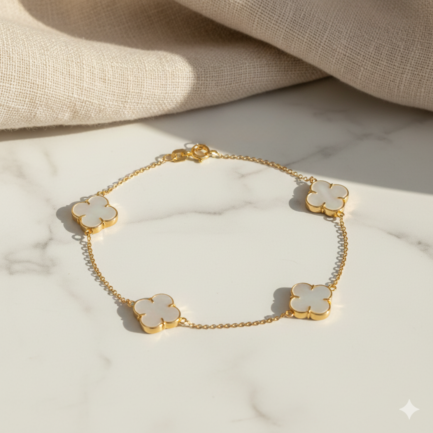 Produzida em Ouro 18k legítimo, esta pulseira é composta por quatro trevos em Madrepérola natural, conhecidos por sua luminosidade única e por simbolizar pureza, harmonia e sorte.