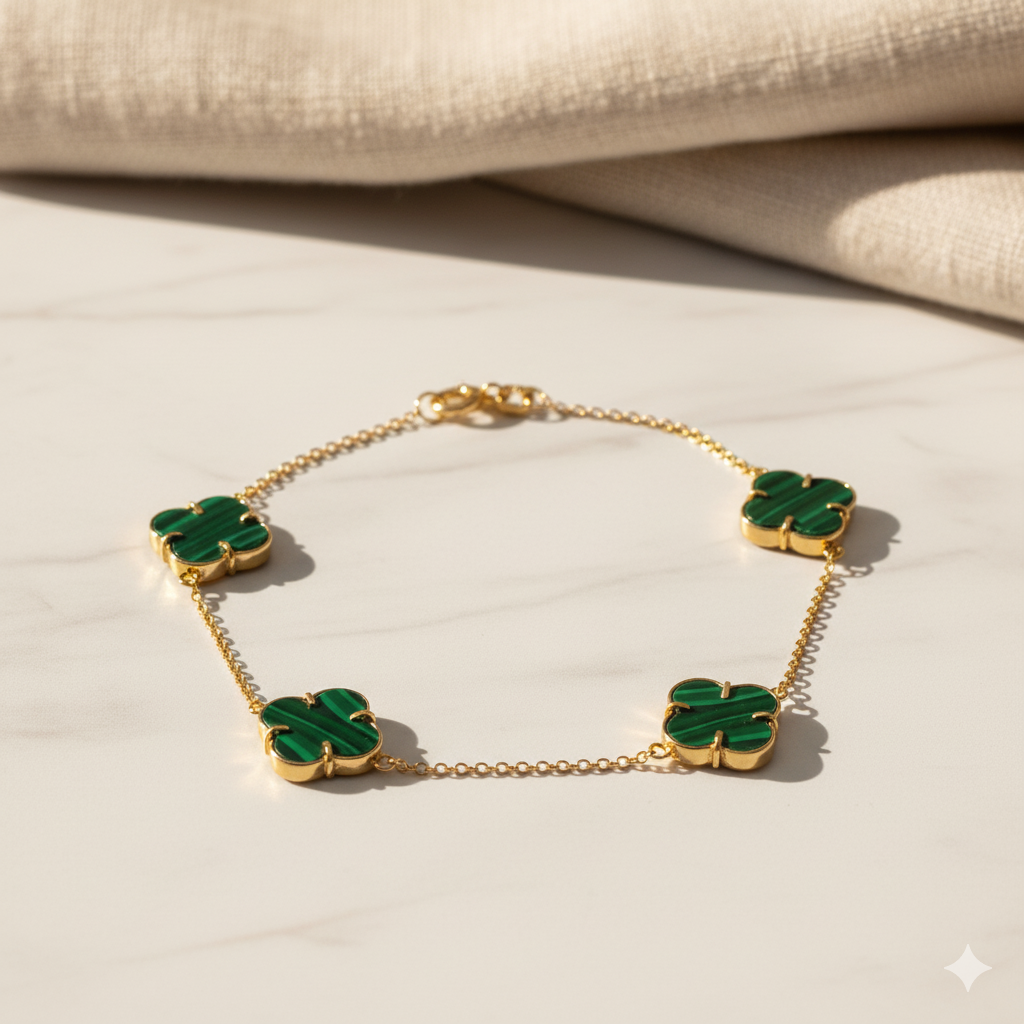 Produzida em Ouro 18k, esta pulseira é composta por quatro trevos em Malaquita natural, pedra conhecida por suas nuances verdes intensas que simbolizam transformação, proteção e equilíbrio.