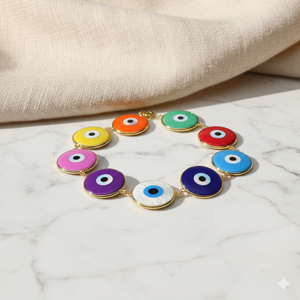 Descubra a união perfeita entre proteção, elegância e estilo. Esta pulseira em Ouro 18k reúne nove Olhos Gregos de 15mm em cores deslumbrantes, cada um irradiando uma energia única. Uma joia que combina beleza, autenticidade e significado, ideal para quem busca peças modernas que falam por si mesmas.