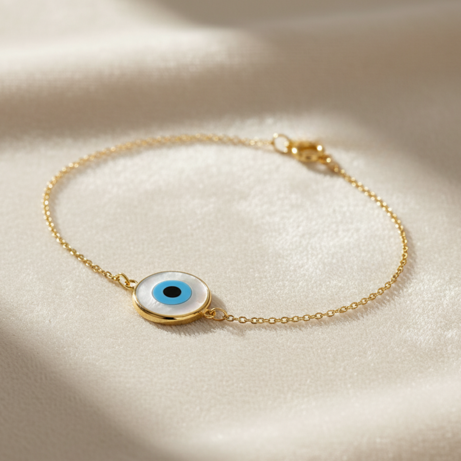 Confeccionada em Ouro 18k, esta pulseira apresenta um Olho Grego de Madrepérola de 15mm central simbolo de energia e proteção, cuidadosamente inserido na corrente, transmitindo charme, brilho e significado. Uma peça atemporal que combina beleza, elegância e simbolismo, perfeita para qualquer ocasião.