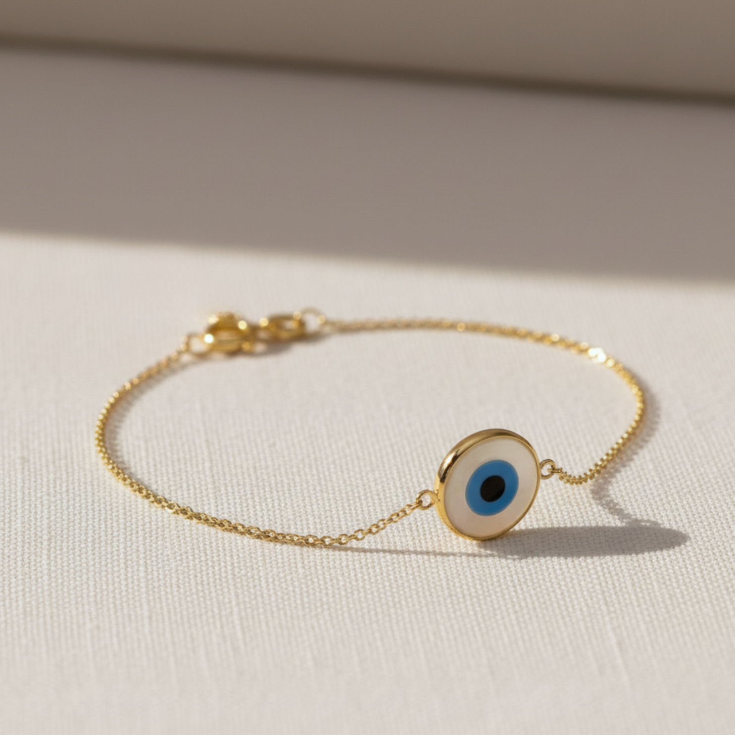 Confeccionada em Ouro 18k, esta pulseira apresenta um Olho Grego de Madrepérola de 18mm central simbolo de energia e proteção, cuidadosamente inserido na corrente, transmitindo charme, brilho e significado. Uma peça atemporal que combina beleza, elegância e simbolismo, perfeita para qualquer ocasião.