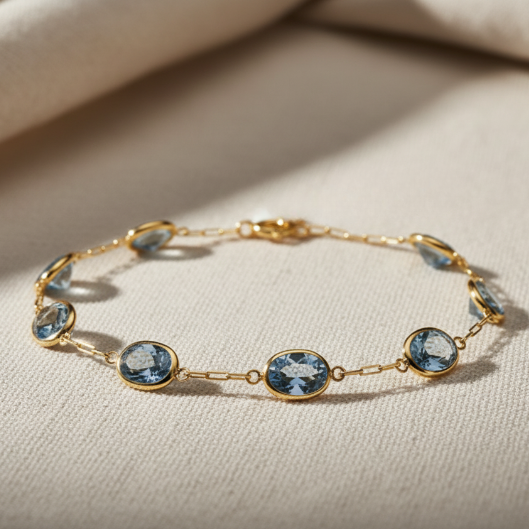 Confeccionada em Ouro 18k, esta pulseira apresenta pedras ovaladas de Água-Marinha de laboratório cuidadosamente espaçadas, criando um design harmonioso que valoriza o brilho suave e o tom azul translúcido das gemas. Uma peça elegante e atemporal, perfeita para quem aprecia beleza, requinte e personalidade.