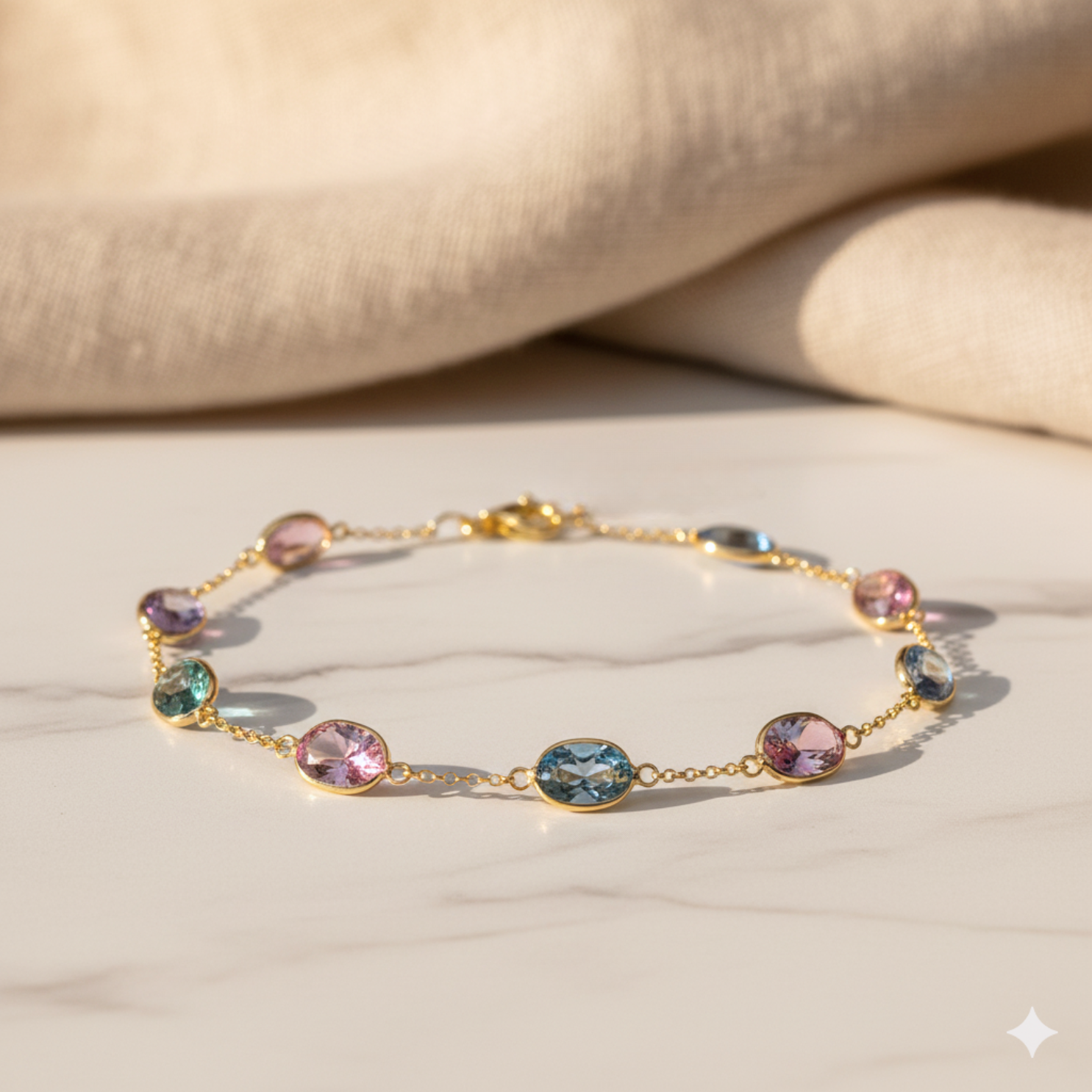 Confeccionada em Ouro 18k, esta pulseira apresenta pedras ovaladas de Zircônias coloridas cuidadosamente espaçadas, criando um efeito vibrante e elegante que destaca o brilho e a harmonia das cores. Uma peça atemporal que combina alegria, estilo e sofisticação em cada detalhe.